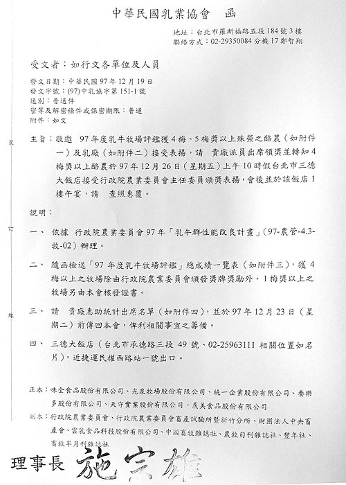 Document No. 151-1 of Dairy Association Taiwan, R.O.C.- Plum Award of「2008 dairy ranch evaluation
