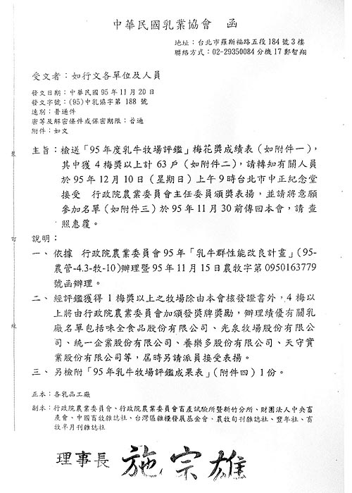 Document No. 188 of Dairy Association Taiwan, R.O.C.- Five Plum Award of「2006 dairy ranch evaluation」.