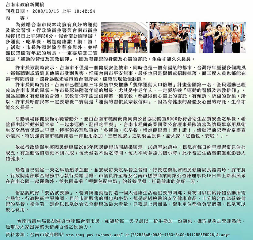 台南市政府新聞稿 - 國農牛乳響應與贊助「多運動,吃早餐」活動